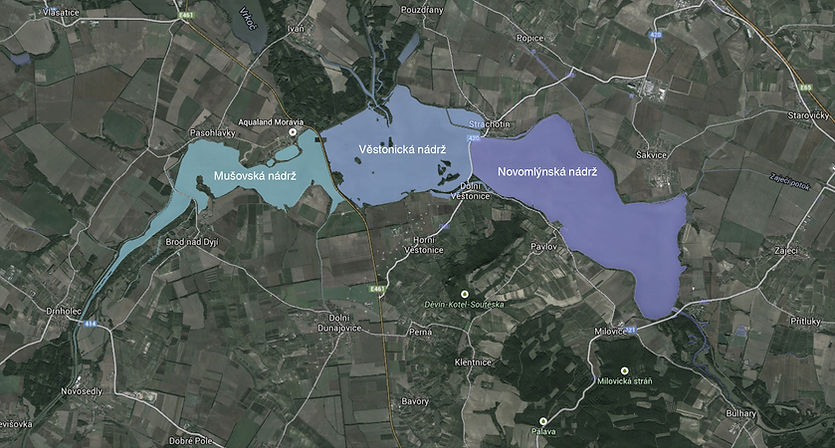 Soustavu vodní toků potom doplňují vodní plochy – rybníky a vodní nádrže. Na jihohozápadní okraj řešeného území zčásti zasahují dvě ze tří novomlýnských nádrží (Věstonická a Novomlýnská). Věstonická nádrž o celkové rozloze 1 033 ha (na území mikroregionu necelých 96 ha) s maximální hloubkou 5,3 m zasahuje do katastrálních území obcí Pouzdřany a Strachotín. Novomlýnská nádrž (3. nejv. v Česku), jejíž celková rozloha činí 1 668 ha a dosahuje maximální hloubky 7,8 m, zasahuje na území obcí Strachotín a Šakvice (zaujímá zde plochu o rozloze přibližně 744 ha). V zájmovém území se nachází také velký počet rybníků a bezejmenných vodních ploch, mezi největší rybníky patří Balaton (k. ú. Brumovice), Boleradický, Borkovanský, Dvorský (k. ú. Šitbořice), Kurdějovský, Pouzdřanský, Strachotínský, Zadní a Přední rybník (k. ú. Hustopeče). Rybníky se nejčastěji využívají k chovu ryb, sportovnímu rybolovu, částečně jsou využívány pro rekreaci.